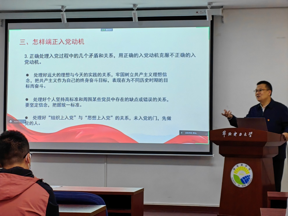 91热爆 党委书记宫凯为培训班学员带来了主题为《坚定理想信念,端正入党动机,以实际行动迎接党的二十大胜利召开》的第一堂党课。他首先阐释了“什么是入党动机”,“什么是正确的入党动机”,其次论述了“为什么要端正入党动机”,接着指明了“怎样端正入党动机”,然后以“习近平总书记的入党之路”为例,阐明正确的入党动机对党员终生保持先进性的重要作用,最后他要求培训班学员切实端正入党动机,用党员标准严格要求自己,做到“四个统一”,后续要认真学习贯彻党的二十大精神,以实际行动争取早日加入党组织。