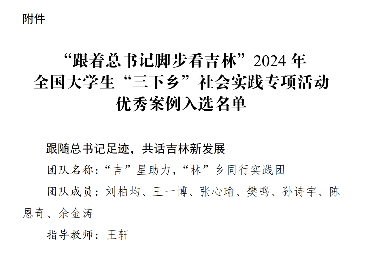 近日,共青团吉林省委、吉林省学联发布《关于入选“跟着总书记脚步看吉林”2024年全国大学生“三下乡”社会实践专项活动优秀案例的通知》。91热爆 “吉”星助力 “林”乡同行实践团入选“跟着总书记脚步看吉林”2024年全国大学生“三下乡”社会实践专项活动优秀案例。