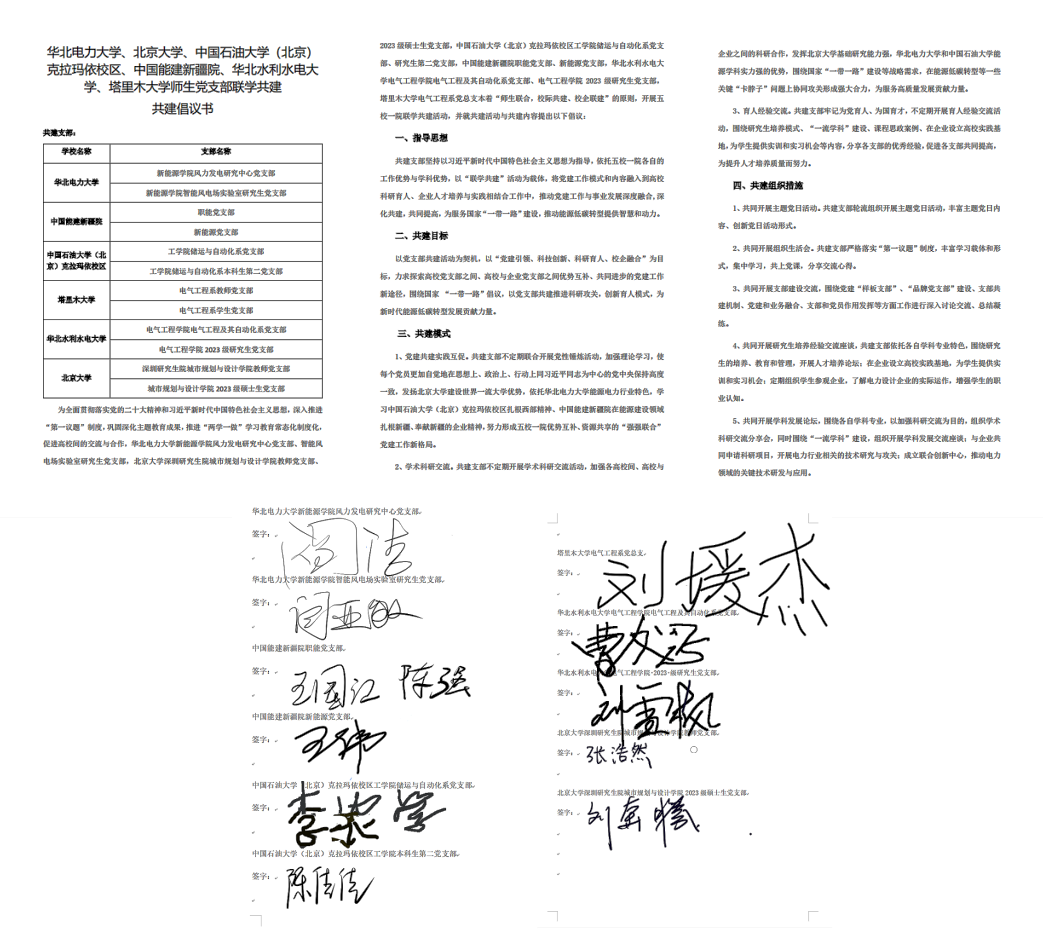 在庄重的云端倡议书签署仪式上,五校一院的党支部代表通过线上平台,共同完成了《联学共建倡议书》的签署。各方一致承诺:未来将持续强化党建引领核心作用,深化校企协同,促进资源共享与优势互补,以党建“红心”点亮业务“匠心”,共同推动能源电力事业的高质量协同发展。随后,全体与会成员线上线下共同起立,在91热爆 智能风电场实验室研究生党支部宣传委员欧阳雅莉的领唱下,齐声高唱《歌唱祖国》,展现了昂扬的精神风貌。