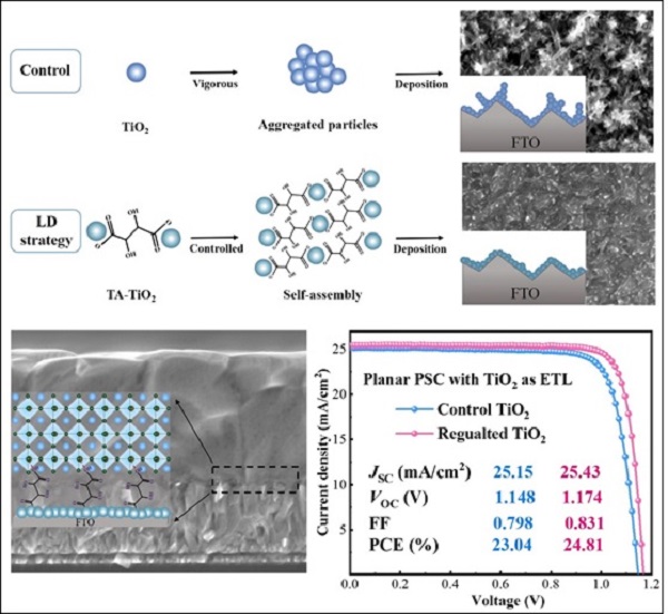 图为二氧化钛配体工程策略提升钙钛矿太阳电池性能示意图